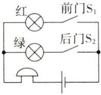 6. 现要为一仓库设计一个电路,取货人在前门按开关$S_1$,电铃响,红灯亮;送货人在后门按开关$S_2$,电铃响,绿灯亮。请你按要求设计一个电路图。