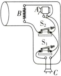 5.(物理学与日常生活)如图所示的是一个有冷、热两挡的电吹风原理示意图,图中$A$是一个带风叶的小电动机,$B$是一段电热丝,$S_1$、$S_2$是两个开关,$C$是接照明电路的插头,请你用笔画线代替导线按要求将这些器材连接成一个电路(连线不要交叉)。