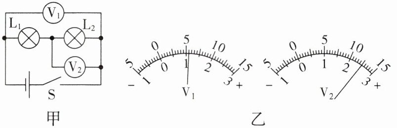 7. 如图甲所示的电路中,开关 $ S $ 闭合后,$ V_1 $、$ V_2 $ 的示数分别如图乙所示,则 $ V_1 $ 的示数为