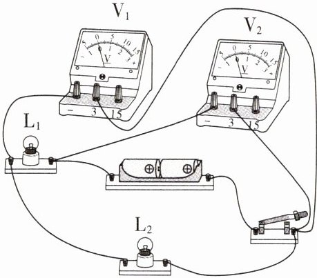 12. 如图所示,当闭合开关后,电压表 $ V_1 $、$ V_2 $ 的示数分别是 $ 1 \, V $ 和 $ 3 \, V $,则小灯泡 $ L_1 $ 和 $ L_2 $ 两端的电压分别为(