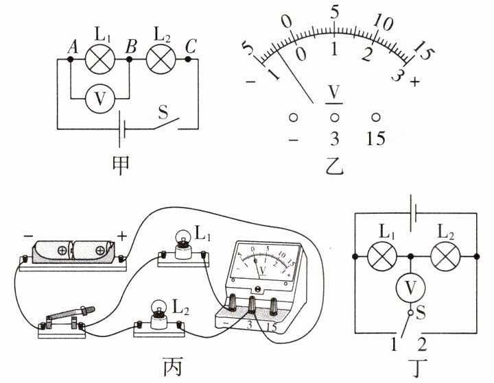 (6)小华观察了小明的实验后,觉得拆装电压表操作过于麻烦,于是他设计了如图丁所示的电路图,认为不用拆接电压表就能测出 $ L_1 $ 和 $ L_2 $ 两端的电压,他的设计不合理的原因是______。