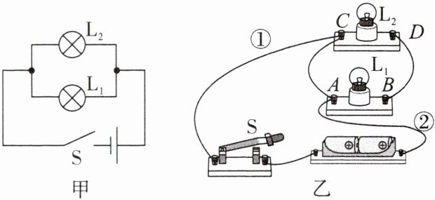 (1)海涛闭合图乙中的开关 $ S $ 后,发现小灯泡 $ L_1 $、$ L_2 $ 不亮,查其原因,原来是因为此时小灯泡 $ L_1 $、$ L_2 $ 处于