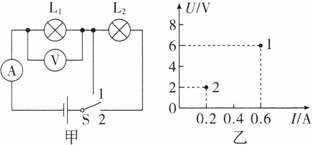 14. 如图甲所示,当开关 $ S $ 由触点 $ 1 $ 转接到 $ 2 $ 时,$ L_1 $ 和 $ L_2 $ 的连接方式是串联,电压表、电流表示数变化如图乙所示,当开关 $ S $ 连接触点 $ 2 $ 时,通过 $ L_1 $ 的电流是