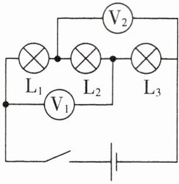 13. 如图所示的电路中,闭合开关,电压表 $ V_1 $ 的示数是 $ 7.5 \, V $,电压表 $ V_2 $ 的示数为 $ 9 \, V $,若电源电压为 $ 12 \, V $,则 $ L_2 $ 两端的电压是(