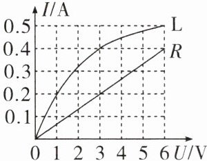 6. 如图所示为灯泡 L 和定值电阻 R 的$I-U$图像,若将 L 和 R 并联在电源电压为 3 V 的电路中,干路电流为