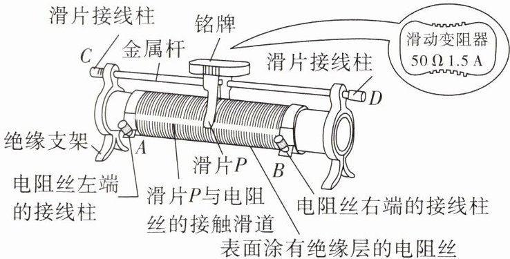 来改变电阻的。图示铭牌上标有“$50\Omega$ $1.5A$”的字样,如果将$A$、$C$接线柱接入电路中,当滑片向$C$端移动时,接入电路的电阻值变小