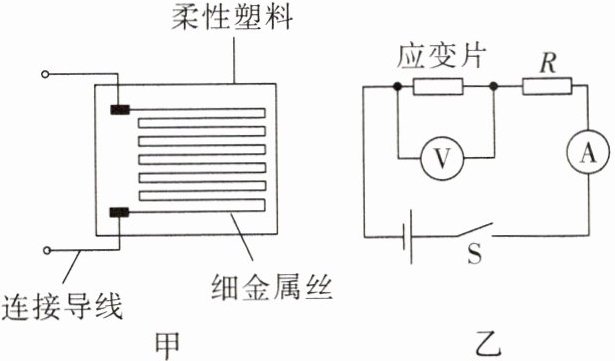 2. (2023·安徽中考)将一根细金属丝置入柔性塑料中,可以制成用来检测物体形变的器件应变片,其结构如图甲所示。将它接入图乙所示的电路,电源电压不变,$R$为定值电阻。闭合开关$S$,当应变片随被检测物体发生拉伸形变时,塑料中的金属丝会被拉长变细,导致电阻变大,则电路中的(