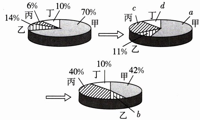 2. 在密闭容器中有甲、乙、丙、丁四种物质,在一定条件下反应,测得反应前及反应过程中的两个时刻各物质的质量分数如图所示。图中 $a$、$b$、$c$、$d$ 分别表示相应物质的质量分数。下列数据正确的是(