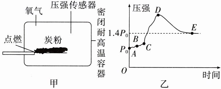 7. (数字化实验)将一定质量的炭粉在密闭容器中通过电阻丝加热引燃(如图甲),一段时间后炭粉消失。用压强传感器测得容器内压强(同温下,容器内压强与气体分子数成正比)随时间的变化关系如图乙。下列分析正确的是(