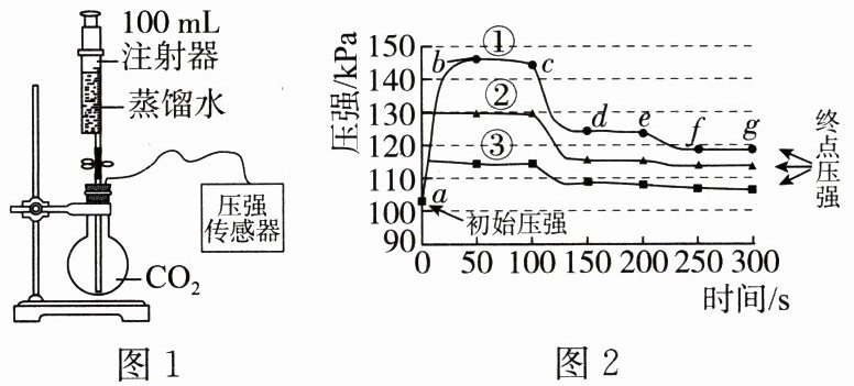 10. (创新实验)(2025芜湖期末)如图1装置是某化学实验小组利用数字化实验研究25℃时二氧化碳气体的溶解性。先打开止水夹,向3个充满二氧化碳的100mL烧瓶中分别注入20mL、40mL、60mL蒸馏水,再关闭止水夹,振荡前后压强的变化如图2所示,则下列说法不正确的是(