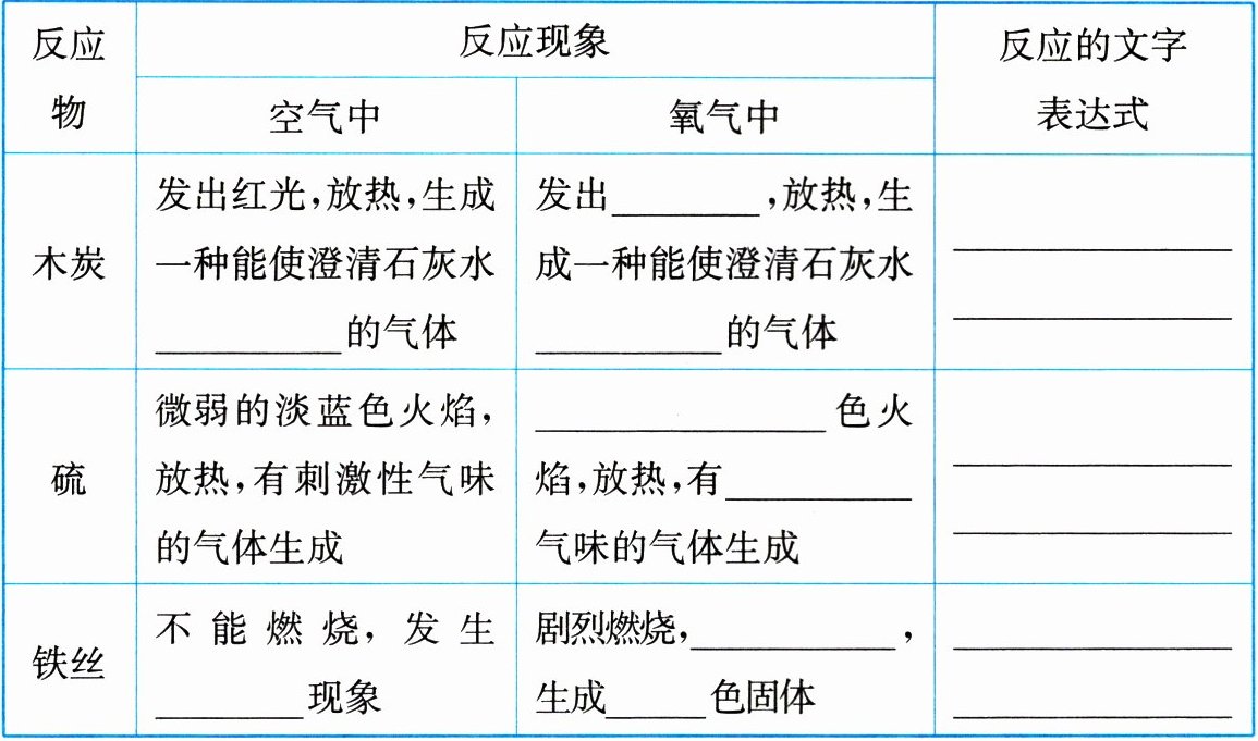 1.带火星的木条 木条复燃 2.变浑浊 白光 变浑浊 碳+氧气$\xrightarrow{点燃}$二氧化碳 明亮的蓝紫 刺激性 硫+氧气$\xrightarrow{点燃}$二氧化硫 红热 火星四射 黑 铁+氧气$\xrightarrow{点燃}$四氧化三铁