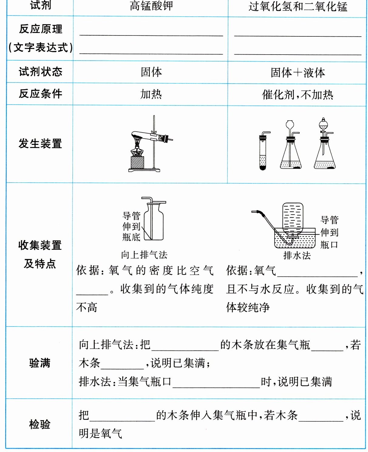 高锰酸钾加热→锰酸钾+二氧化锰+氧气 过氧化氢二氧化锰→水+氧气 略大 不易溶于水 带有火星 口 复燃 有大气泡冒出 带有火星 复燃