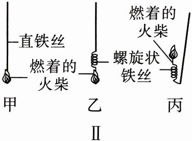 4. (4)铁丝在氧气中燃烧的现象是**剧烈燃烧,火星四射,放出大量的热,生成黑色固体**。在做铁丝燃烧实验时,如图Ⅱ所示的三种做法中,你认为最容易成功的是**乙**。