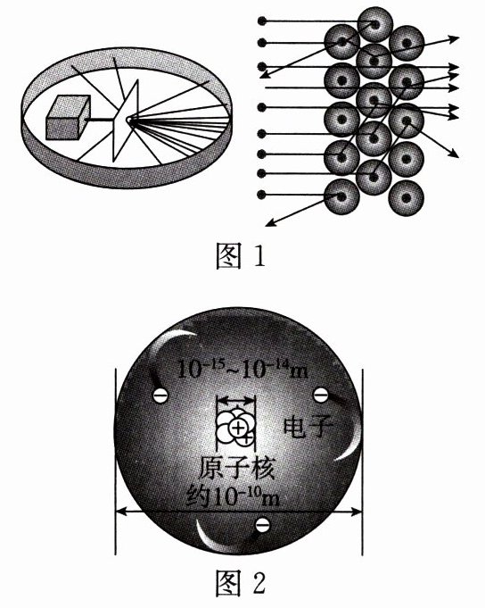 (填“正确”或“错误”)的。(2)卢瑟福用$\alpha$粒子轰击金箔后产生散射现象(如图1),在分析实验结果的基础上,他提出了原子结构模型(如图2)。卢瑟福这一研究是