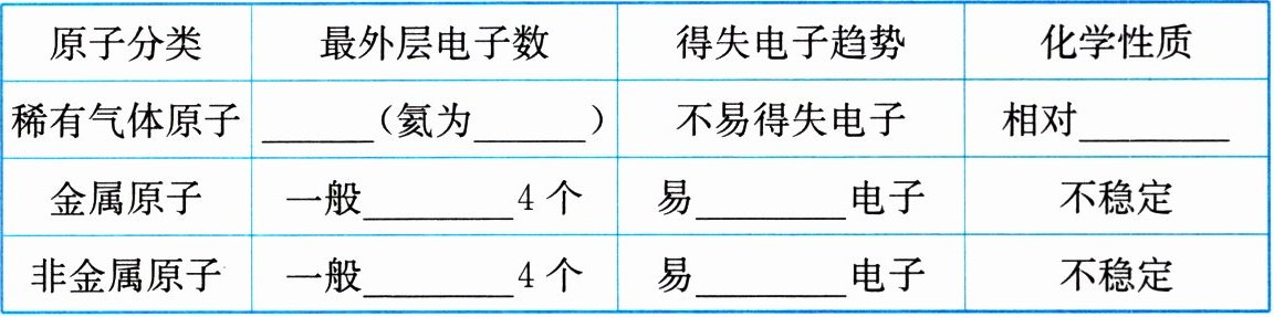 1. 分层排布;3. 8;2;稳定;少于;失去;多于;得到;最外层电子数;最外层电子数