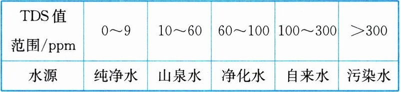(2) 水质监测 TDS(溶解性总固体)是一项重要的指标,主要反映水中钙离子、镁离子、钠离子、钾离子等离子的含量,不同水源 TDS 值的参考标准如表。