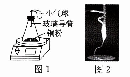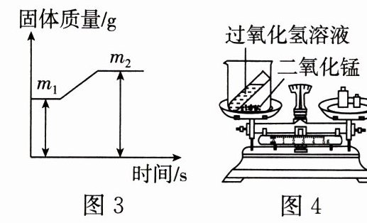 (2)图 1 实验所做的是铜与氧气反应前后质量的测定实验,观察到的现象有______,小气球先变鼓后变瘪,反应前后电子秤读数不变。图 4 中二氧化锰起______作用。如图 2 中镁条在空气中完全燃烧后生成氧化镁(只考虑氧气参加反应,下同),反应的文字表达式为______;若固体质量变化用图 3 表示,则$m_{2}与m_{1}$的差值表示______的质量。