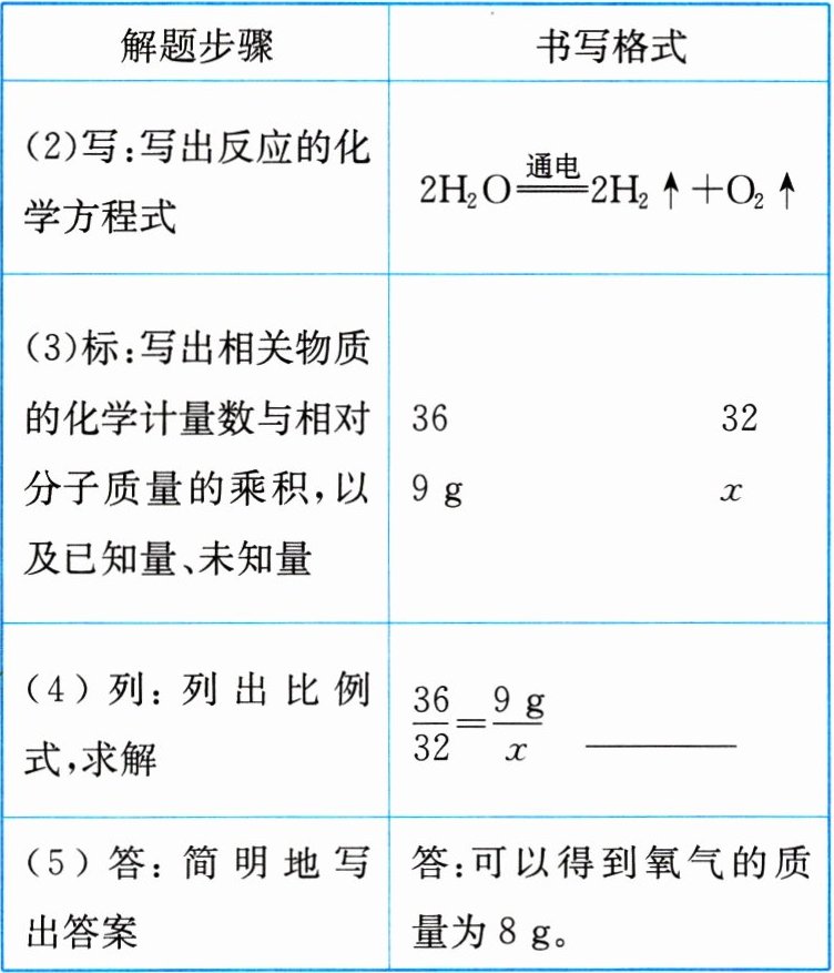 以“9 g 水完全分解,可以得到多少克氧气”为例,写出化学方程式计算的基本步骤和格式。