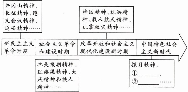 (2)①这些精神都是在特定的时代背景下形成的,是中华民族精神的丰富和发展。②这些精神是中华民族生生不息、发展壮大的强大精神支柱,是维系我国各族人民世世代代团结奋斗的牢固精神纽带,是激励中华儿女为实现中国梦而奋斗的不竭精神动力。