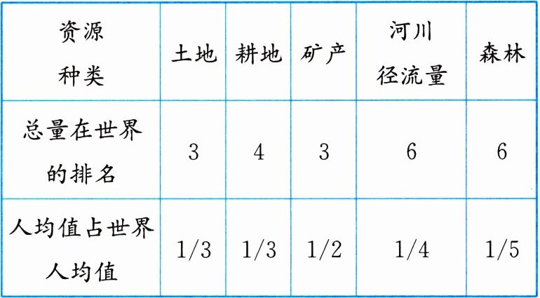 |人均值占世界人均值|1/3|1/3|1/2|1/4|1/5|