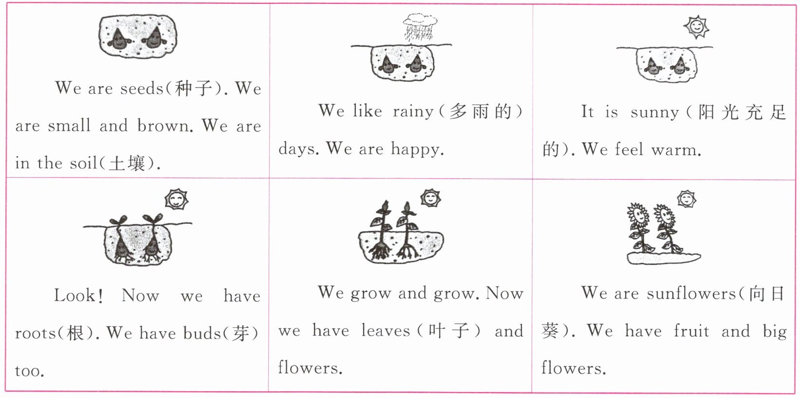 |We are seeds(种子). We are small and brown. We are in the soil(土壤).|We like rainy(多雨的) days. We are happy.|It is sunny(阳光充足的). We feel warm.|
