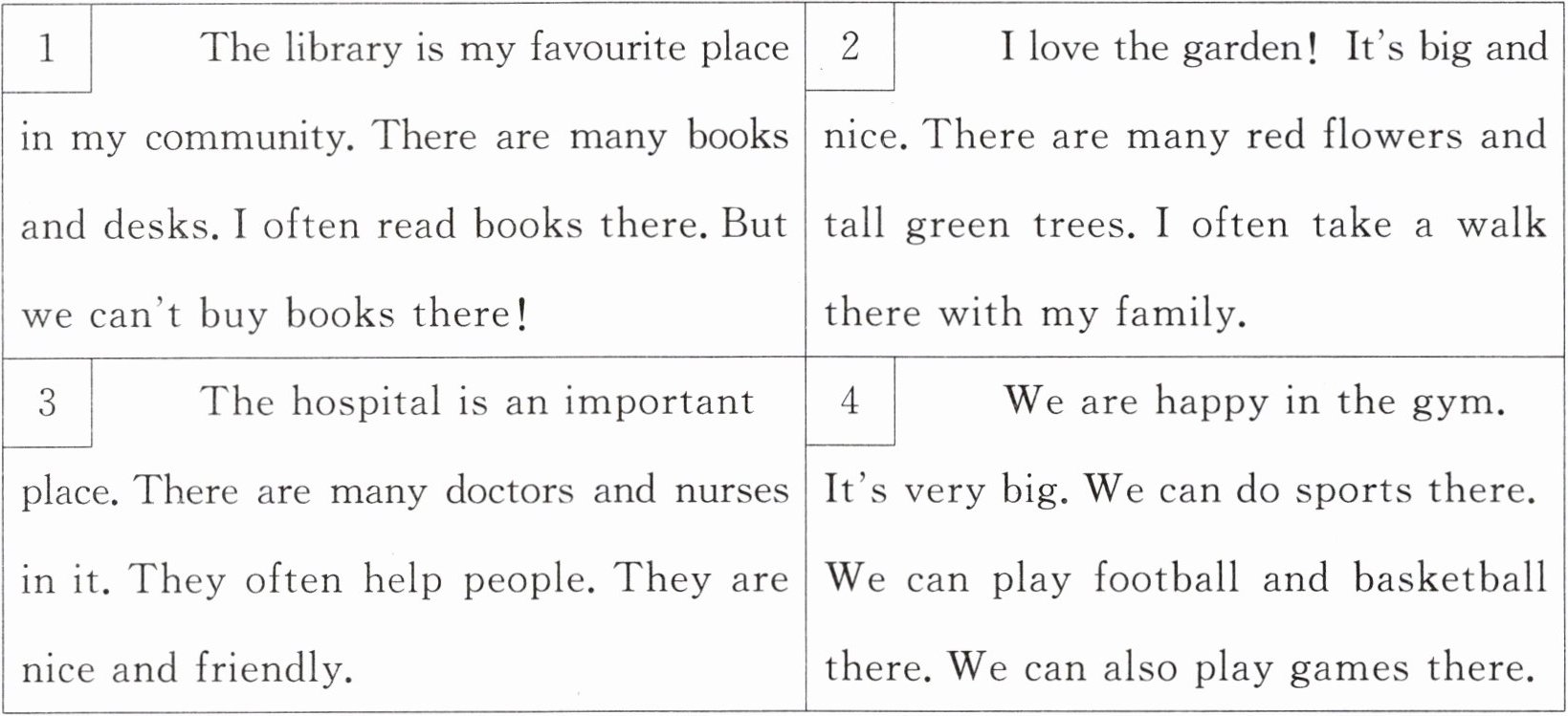 |1|The library is my favourite place in my community. There are many books and desks. I often read books there. But we can't buy books there!|2|I love the garden! It's big and nice. There are many red flowers and tall green trees. I often take a walk there with my family.|