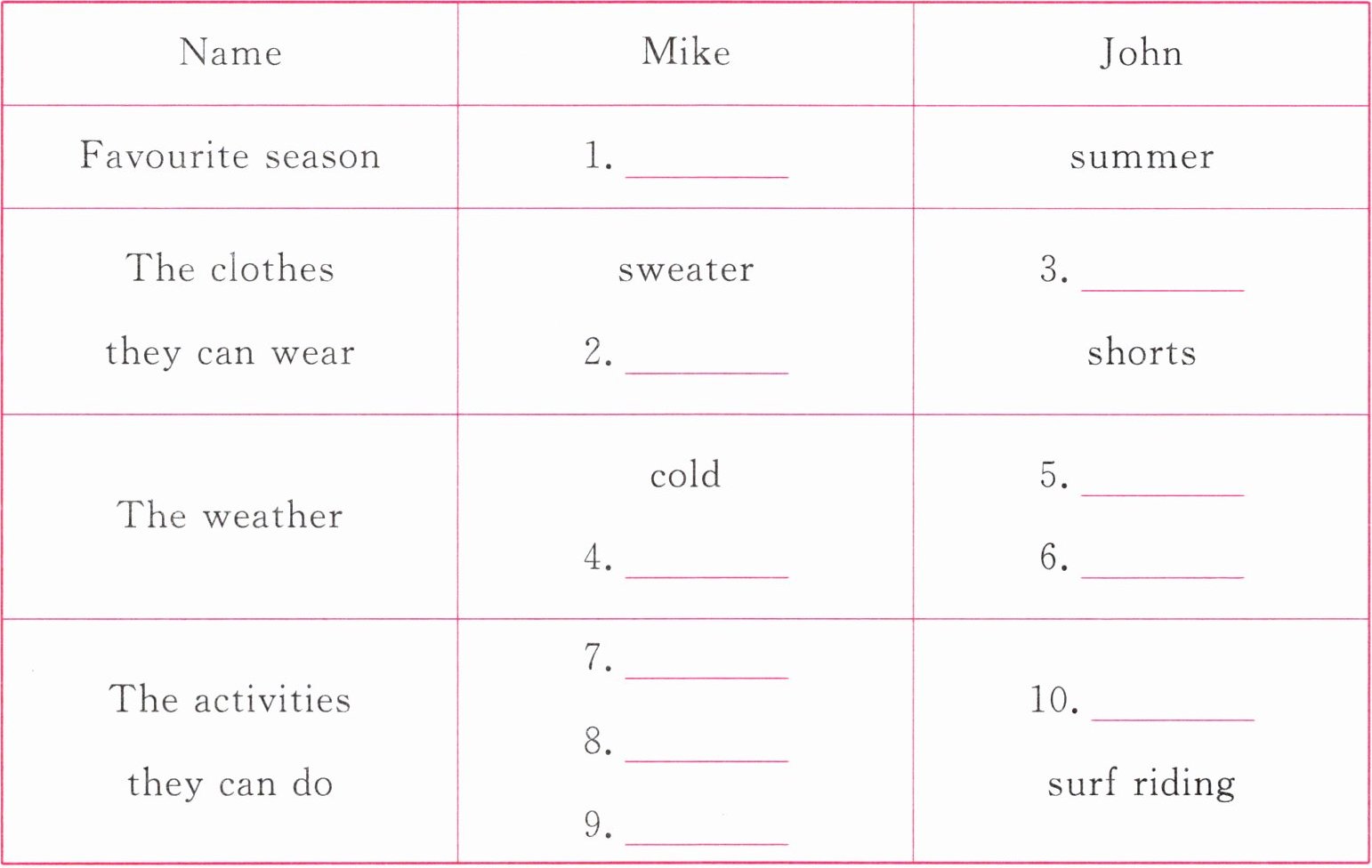 | Favourite season | 1. ______ | summer |