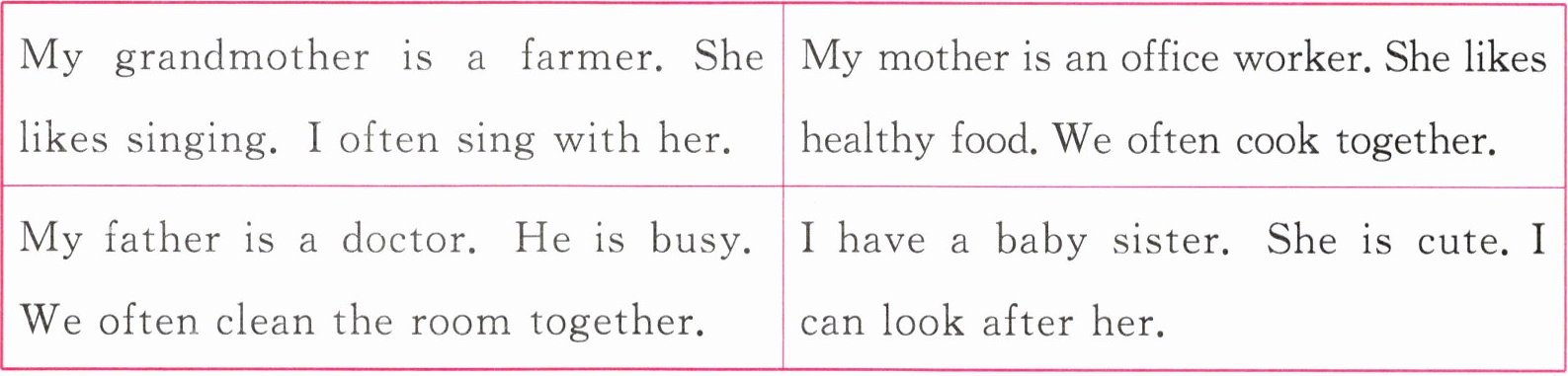 My grandmother is a farmer. She likes singing. I often sing with her.