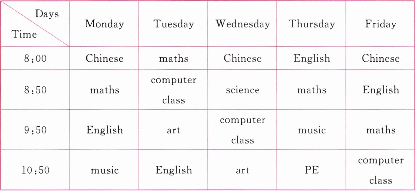 | 8:00 | Chinese | maths | Chinese | English | Chinese |