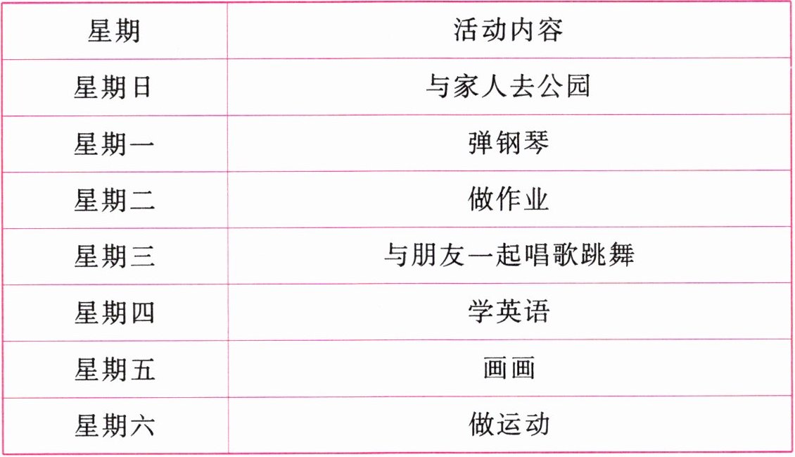 | 星期三 | 与朋友一起唱歌跳舞 |