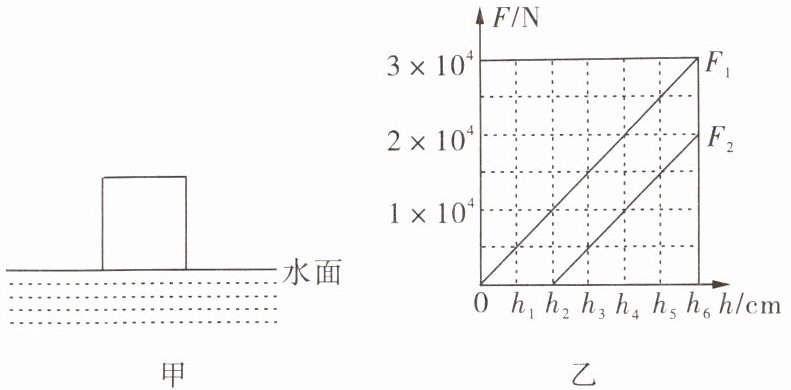 6. 在建设桥梁时,需将一重为 $ 3 × 10^{4}N $的正方体桥梁部件从运输船上转移至河水中。如图甲所示,缓慢地将部件匀速投入水中。水对部件下表面的压力记作 $ F_{1} $,水对部件上表面的压力记作 $ F_{2} $,二者与部件下表面在水中的深度 $ h $的关系如图乙所示(忽略水的阻力)。则部件浸没时受到的浮力为