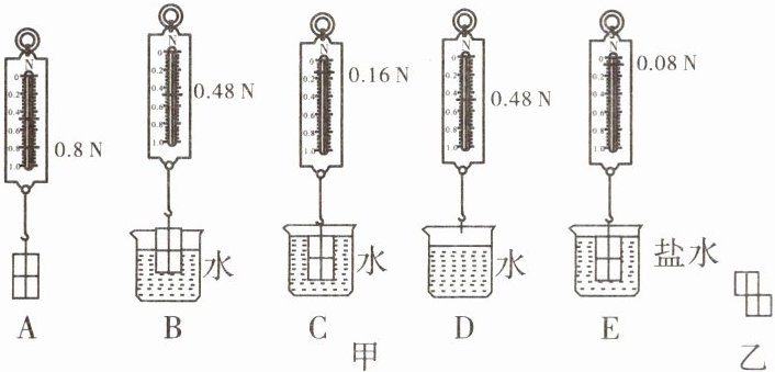 小组为验证上述猜想,用弹簧测力计、4 个相同的小长方体磁力块、2 个分别盛有水和盐水的烧杯等,按图甲步骤进行实验: