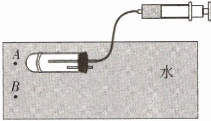 4. 如图所示的是小明同学制作的潜水艇模型,通过向试管中吹气和吸气(不计进排气管体积),让原本悬浮在 A 位置的“潜水艇”下潜至 B 位置悬浮,下列分析正确的是(