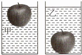 1. 将同一个苹果分别放入两种液体中,苹果静止后,情形如图所示。苹果在甲液体中受到的浮力为 $ F_{甲} $,在乙液体中受到的浮力为 $ F_{乙} $,则(