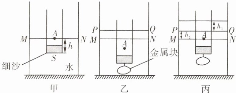 4. 某兴趣小组要测量一金属块的密度,设计了如下方案:将装有适量细沙的薄壁圆筒,缓慢竖直放入盛有适量水的、水平放置的长方体透明薄壁容器中,待圆筒静止后,在圆筒上对应水面的位置标记一点 $ A $,并在长方体容器上标出此时的水位线 $ MN $(如图甲所示);然后将待测金属块用细线悬挂在圆筒下方,缓慢竖直放入水中,圆筒静止后(金属块不接触容器底部),在长方体容器上标出此时的水位线 $ PQ $(如图乙所示);再向长方体容器中缓慢注水至圆筒上的 $ A $ 点与 $ MN $ 在同一水平面上(如图丙所示)。测出 $ PQ $ 与此时水面的距离为 $ h_1 $,与 $ MN $ 的距离为 $ h_2 $。若圆筒的底面积为 $ S $,长方体容器的底面积为 $ 4S $, $ A $ 点到圆筒底部的竖直距离为 $ h $,不计细线的质量和体积,已知 $ \rho_{水} $ 和 $ g $。