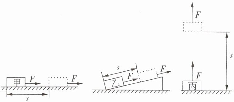 7. 现有甲、乙、丙三个质量不同的物体$(m_1>m_2>m_3),$在相等的恒力F作用下,分别在水平方向、沿斜面向上、竖直方向通过了相等的距离s。如图所示。F在三种情况下做的功分别为$W_1、$$W_2、$$W_3,$三者大小判断正确的是(