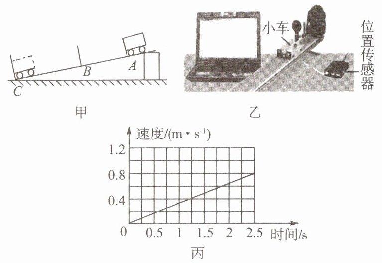 (选填“A”或“B”)处由静止释放,并在C处停止计时。(3) 物体运动的情况还可以通过另一种办法即时测定、显现出来。位置传感器利用超声波测出不同时刻小车与它的距离,计算机就可以算出小车在不同位置的速度(如图乙)。屏幕图像如图丙所示,横轴为时间,纵轴为速度,通过图像可以看出小车在斜面上滑下时是______