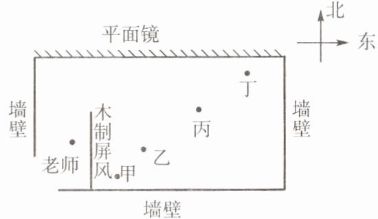 3. 如图所示的是艺术体操训练房的俯视图,训练房的北墙有一大平面镜,当老师从室外进入到图示位置时,甲、乙、丙、丁四位同学能通过平面镜观察到老师的是( )