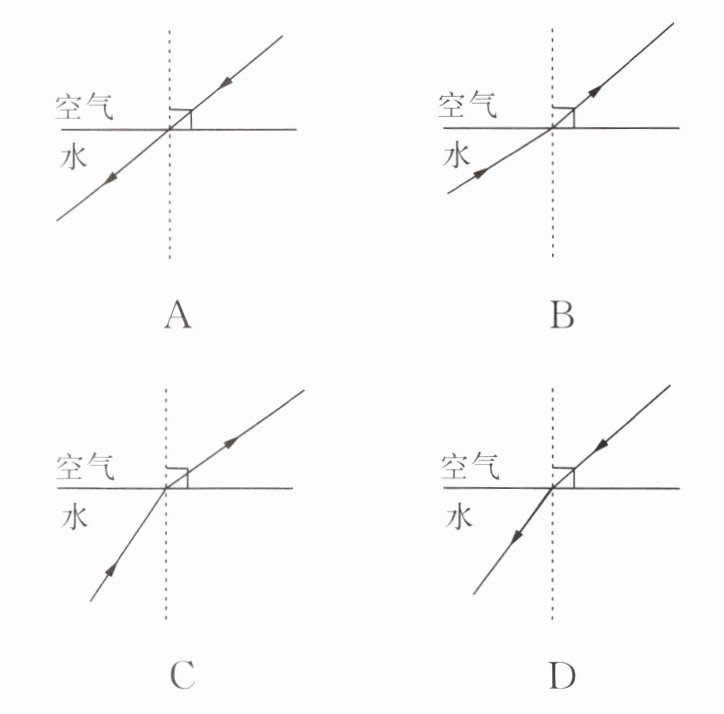 7. 如图所示,嘉嘉同学站在平静的澄池边看到“房在水中现,鱼在房上游”。关于他看到水中鱼的光路图,正确的是(