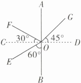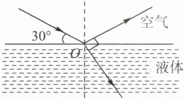 1. 如图所示为一束光从空气斜射到某液面上,与液面的夹角为 $30^{\circ}$,且反射光线与折射光线相互垂直。这个现象中,折射角是
