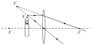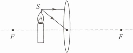 3. 如图所示,图中已画出由烛焰上 $ S $ 点发出的两条入射光线,请画出其经过凸透镜折射后的两条折射光线,并标明发光点 $ S $ 的像点 $ S' $ 的位置。(保留必要的作图痕迹)