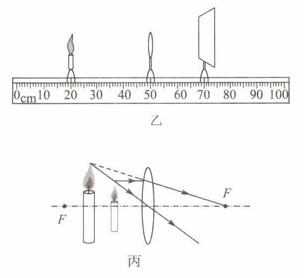 (选填“前方”或“后方”)。(4) 取下眼镜镜片后继续向右移动蜡烛,看到如图丙所示的成像情况,利用这个成像原理可制成
