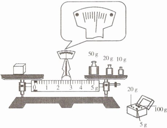 3. 小明在实验室测量某物体的质量,最终测得其质量为82.4g,砝码盒中有100g、50g、10g、5g砝码各一个,20g砝码两个,则小明在右盘中加入最小的5g的砝码后,接下来应该进行的正确操作是