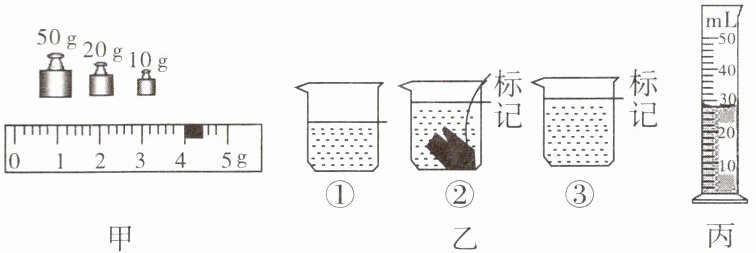 处,量筒中的水位如图丙所示。(4) 旁边的小敏发现取出的模型粘了水,不能采用量筒的数据,于是测出图乙③中烧杯和水的总质量为155 g,小敏计算出模型的密度为
