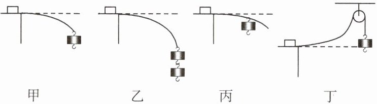 3. 力的作用效果与哪些因素有关呢?为了探究这个问题,小明设计了这样的实验:用一个弹性较好的钢片固定在桌边,在钢片上用细线挂钩码,通过钢片受力而发生的形变来研究问题。如图所示的是小明设计的实验的几个主要步骤(小明使用的钩码规格相同)。