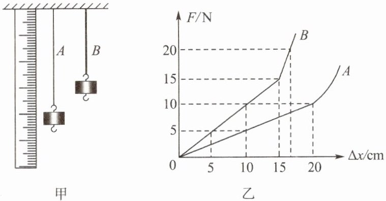 7. 为研究橡皮筋是否也与弹簧有类似的性质,某实验小组的同学对A、B两根长度相同、粗细不同的橡皮筋进行研究,并做成橡皮筋测力计。将橡皮筋的一端固定,另一端悬挂钩码(如图甲所示),记录橡皮筋受到的拉力大小F和橡皮筋的伸长量Δx,根据多组测量数据画出的图线如图乙所示。