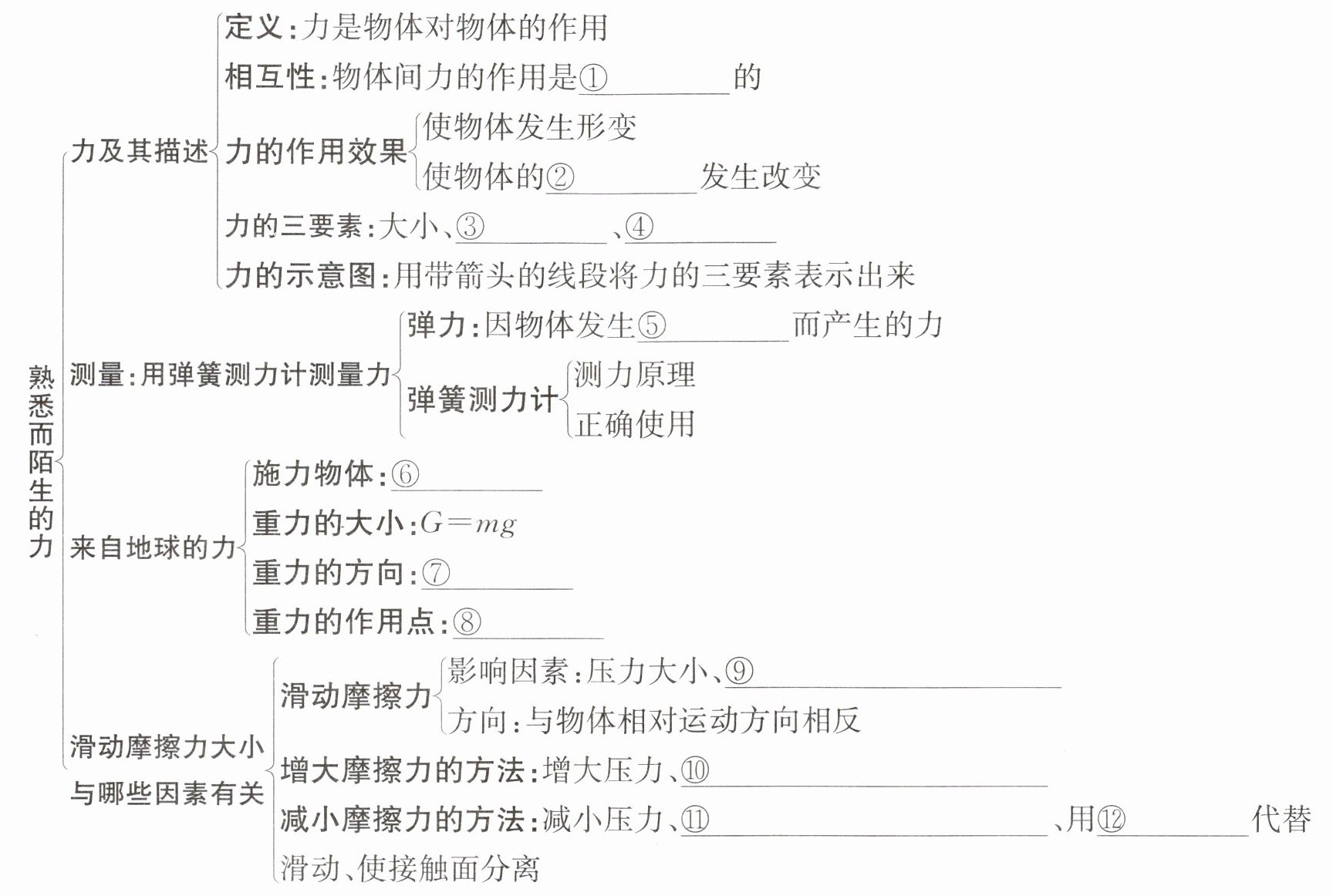 ①:相互 ②:运动状态 ③:方向 ④:作用点 ⑤:弹性形变 ⑥:地球 ⑦:竖直向下 ⑧:重心 ⑨:接触面的粗糙程度 ⑩:增大接触面的粗糙程度 ⑪:减小接触面的粗糙程度 ⑫:滚动