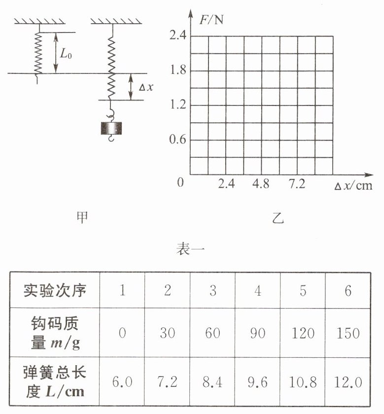 7. 为研究弹簧的性质,我们在竖直悬挂的弹簧下加挂钩码(如图甲所示),同时记录弹簧总长度$L与钩码质量m$,所得数据记录在表一中。已知弹簧原长$L_{0}= 6.0\ cm$。实验过程中,弹簧形变在弹性限度内,不计弹簧所受的重力。($g取10\ N/kg$)