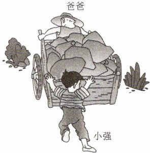 1. 如图为农忙季节小强帮助爸爸干农活的情景。已知爸爸用 $ 500 \, N $ 的拉力拉车,小强用 $ 300 \, N $ 的推力帮爸爸向前推车,他们的合力大小为