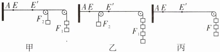物理老师利用橡皮筋、定滑轮、钩码、小绳子,和同学们一起探究同一直线上二力的合成,实验装置如图所示,橡皮筋原长为 $ AE $,在力 $ F_1 $、$ F_2 $ 的共同作用下伸长到 $ AE' $。